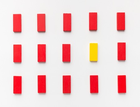 Winner lottery, lucky concept. One yellow wooden block among red ones on white