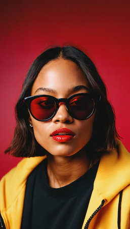 photo of beautiful african woman with style sunglasses standing against red and yellow background, generative AI