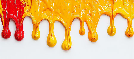 A vivid close-up image showcasing colorful liquid flow, featuring vibrant yellow and red shades. Dew droplets enhance the surface texture, creating an artistic visual experience.