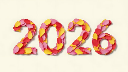 The numbers 2026 are formed from red, pink, and yellow flower petals on a light background.