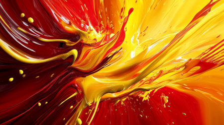 A dynamic 3D splash of bright yellow and rich red, with fluid, vibrant shapes radiating from the center, creating a high-energy and striking abstract background with vivid colors.
