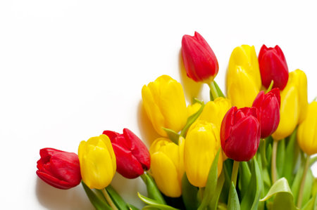 Mother's Day Design Concept, Tulip flower bunch - Beautiful Red, yellow bouquet isolated on white background table, top view, flat lay, copy space