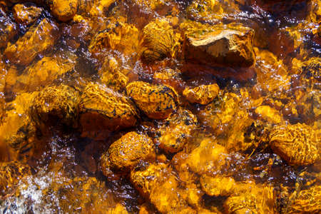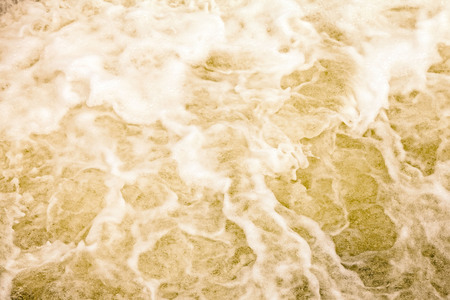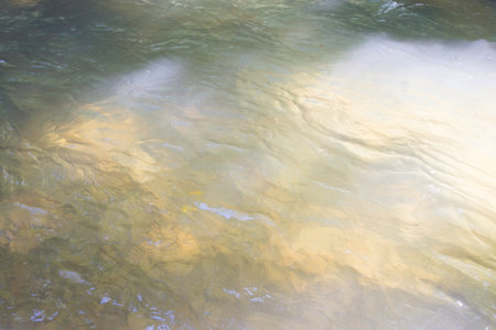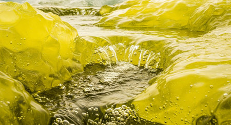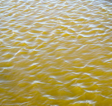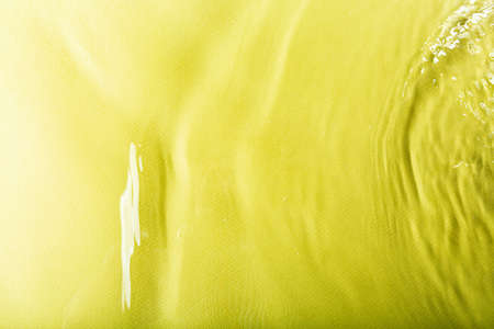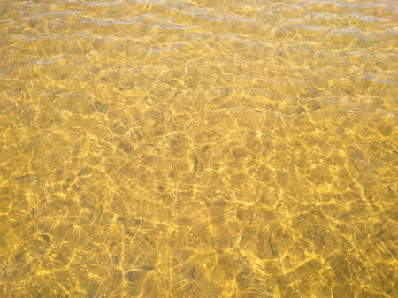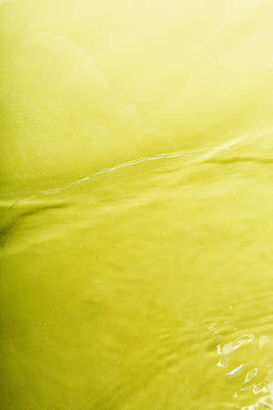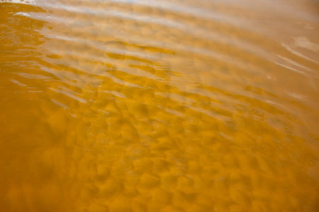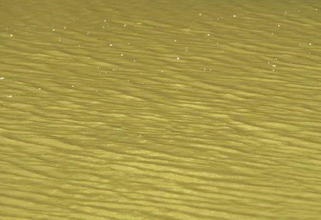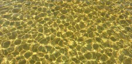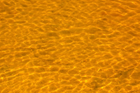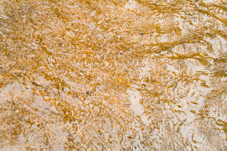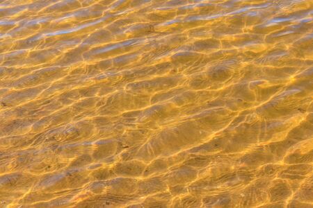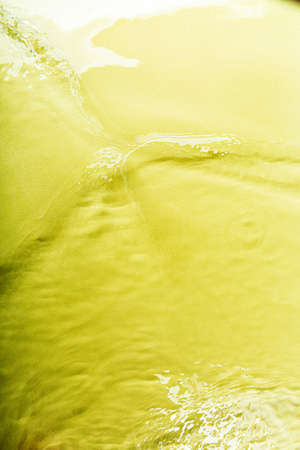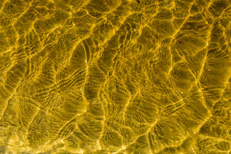 Abstract summer background. Transparent yellow clear water surface texture with ripples, splashes and bubbles. Top view