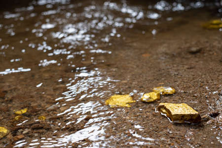 Water flowing through stones and rocks in the river on a sunny day. selective focus