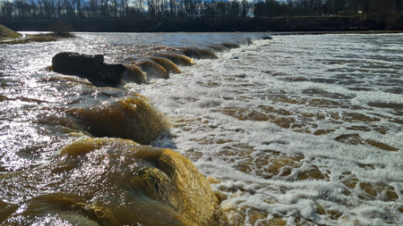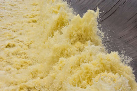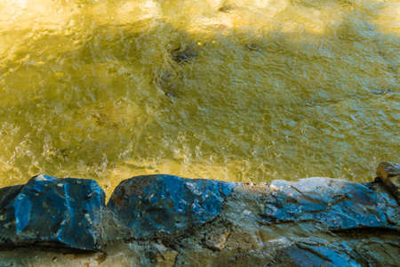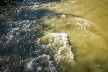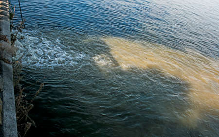 Dirty orange water from sewage pipeline mixes with river water. Clear border between two different water streams. Environmental pollution theme.