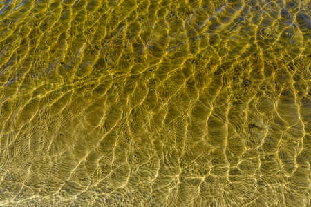 Beautiful clear water with light ripples and a bottom-visible sandy lake on a sunny hot summer day. Concept of Pure Freshwater. Place for text