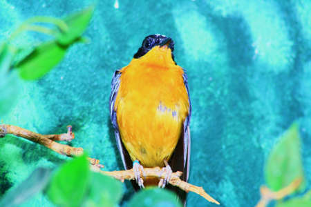 Bird (Narcissus Flycatcher, Ficedula narcissina) male black, orange, orange-yellow color perched on a tree in the garden risk of extinction