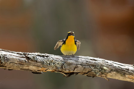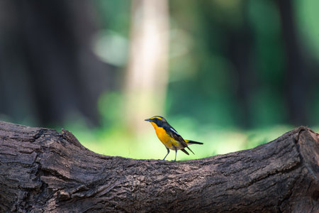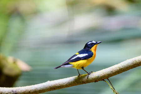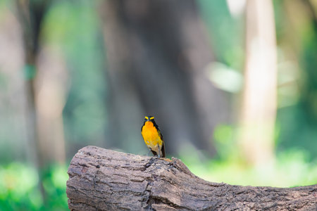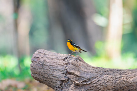 Bird (Narcissus Flycatcher, Ficedula narcissina) male black, orange, orange-yellow color perched on a tree in a nature wild and risk of extinction