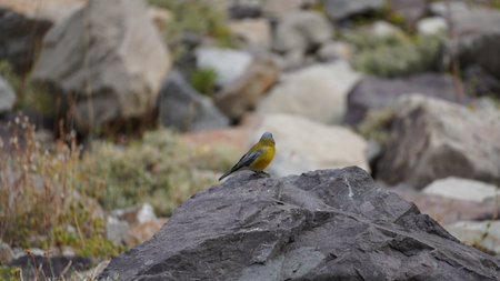The hooded grosbeak bright yellow colored bird at high altitude of ten thousand feet height.