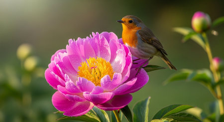 Vibrant yellow warbler perched atop a blossoming pink peony