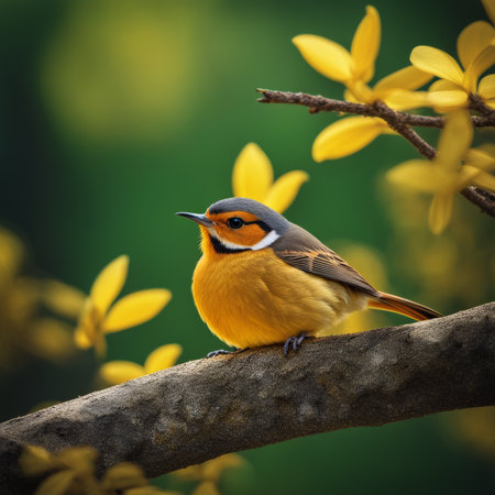 A small, colorful bird rests peacefully on a branch adorned with delicate white blossoms. A serene and beautiful nature scene.