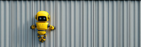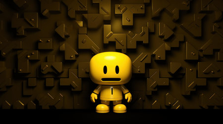3d rendering of yellow robot in front of a wall with arrows
