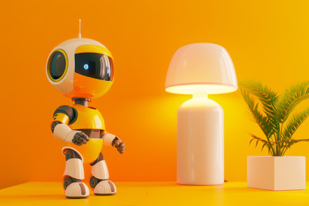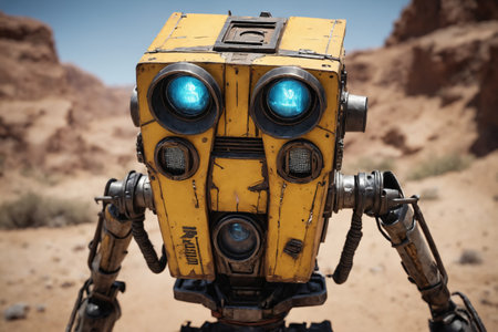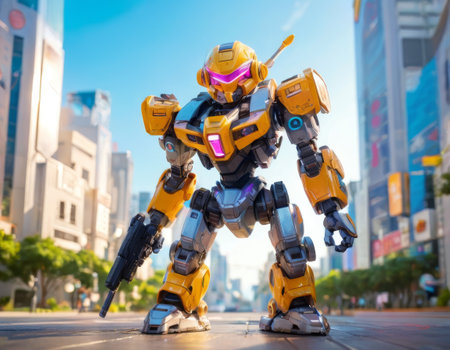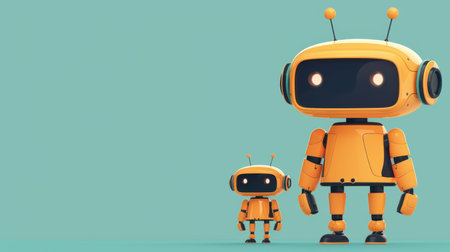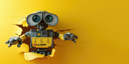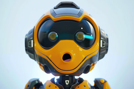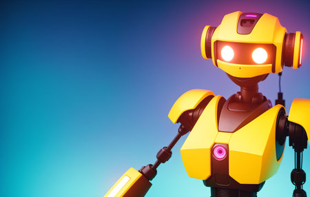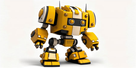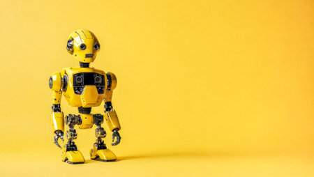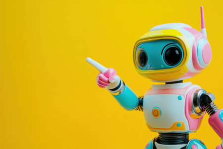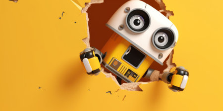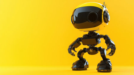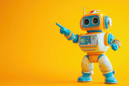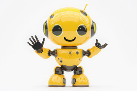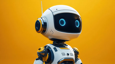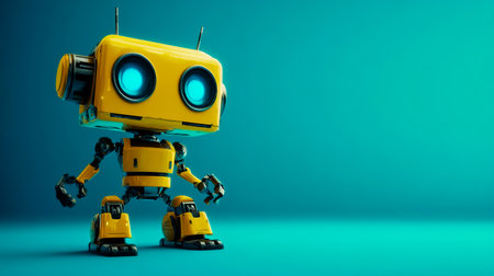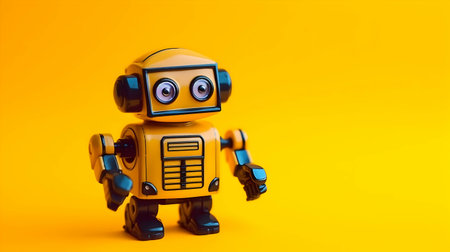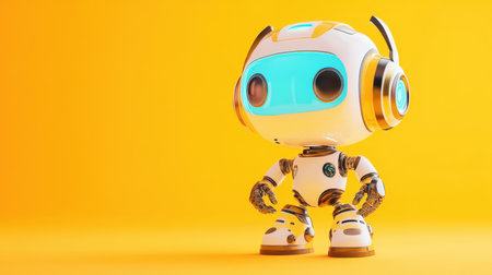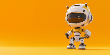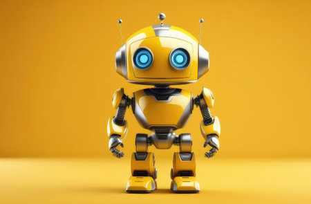 This colorful cartoon robot features a cheerful design with a large head and sleek body, set against a vivid yellow background. Perfect for creative projects.