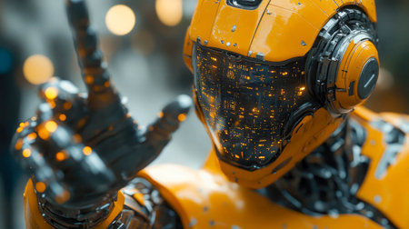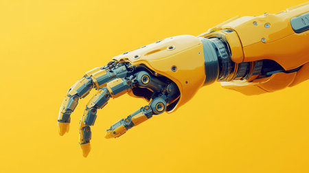 This vibrant image features a close-up of a futuristic robotic hand against a bright yellow background. The design showcases intricate mechanisms and modern technology ideal for innovation themes.