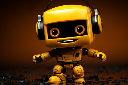 Yellow robot in sports gear and helmet, with headphones, on black background