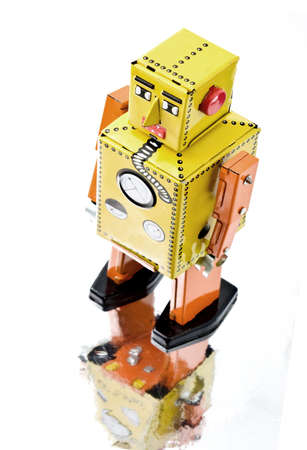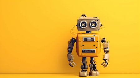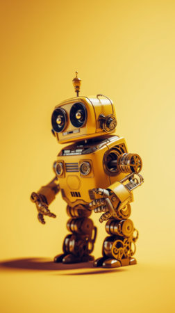 vintage robot toy on yellow background with copy space, future technology concept