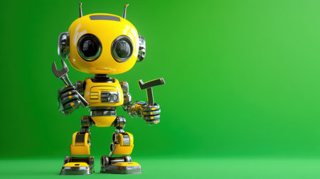 A cheerful yellow robot character holds a wrench and a hammer against a vibrant green background, embodying creativity and modern technology in a playful design.