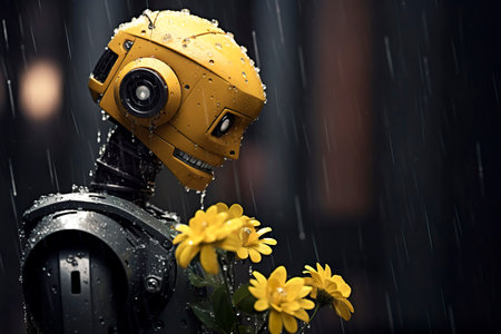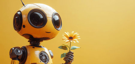Humanoid robot holds a flower, symbolizing peace and connection with humanity