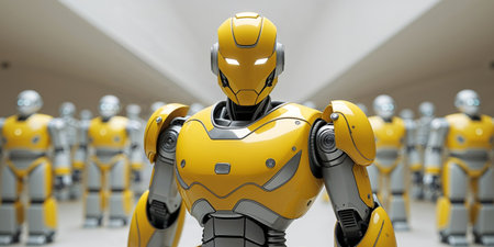 A striking depiction of a futuristic yellow robot standing prominently among many similar robotic figures, showcasing advanced technology and design in an urban setting.