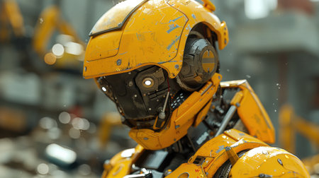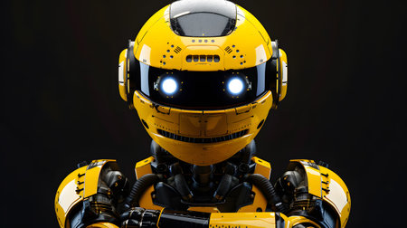 Robot in yellow helmet on a dark background. generative ai