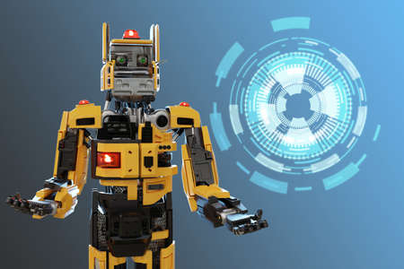 Smiling happy autonomous bionic personal assistant helper robot. Yellow interactive robot with scanner in its eyes. Robotic trend modern technology future concept.