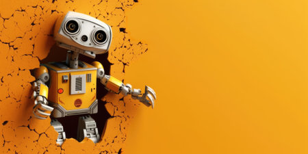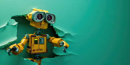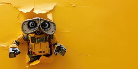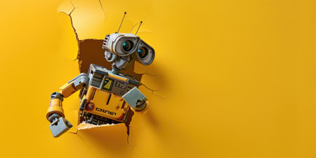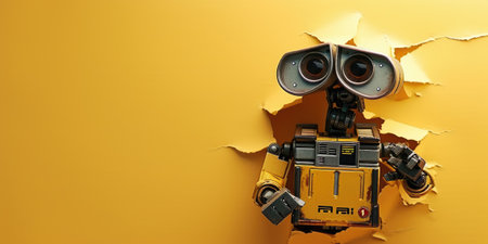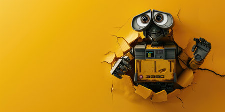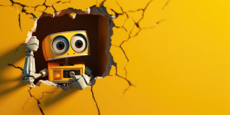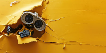Cute robot toy peeking out of a hole in wall, torn hole, empty copy space frame, mockup. Generative AI image weber.