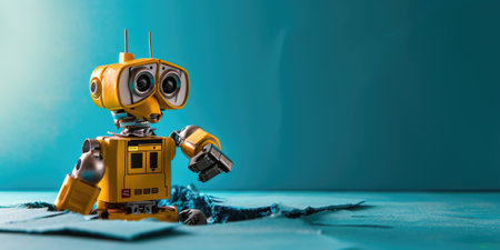 Vintage yellow robot toy with charming design in classic style on teal surface in a simple setting. Generative AI