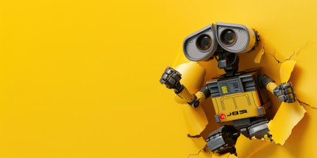 futuristic robot of new generation, yellow banner with copy space, made with Generative AI