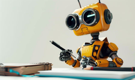 vintage robot with notebook and pencil on white background, education concept