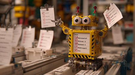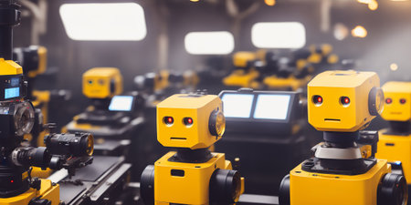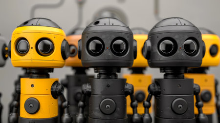 A row of small yellow and black robots standing next to each other, AI