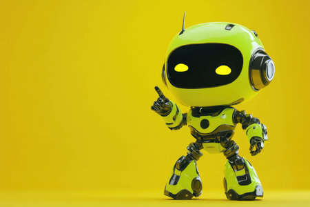 A cheerful robot with a shiny green exterior and yellow glowing eyes stands confidently, pointing upwards. The backdrop is a vibrant yellow, adding to the futuristic feel of the scene.