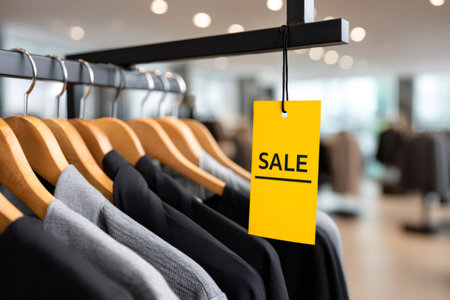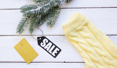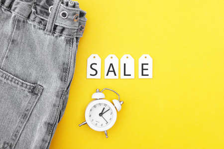 Flat lay, detail of black jeans, white labels and inscription Sale on yellow background.