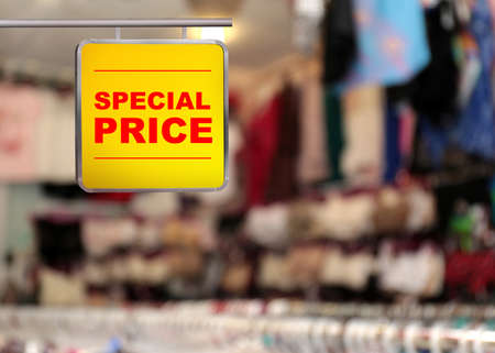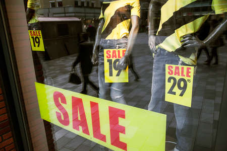 Detail of black jeans, grey labels and inscription Sale on yellow background.