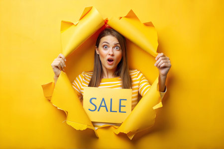 A young woman holding sale writing through torn paper hole in the yellow wall.