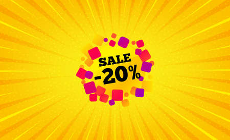 Sale 20 percent off banner. Yellow background with offer message. Discount sticker shape. Coupon bubble icon. Best advertising coupon banner. Sale 20 badge shape. Abstract background. Vector