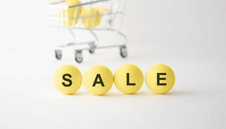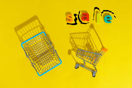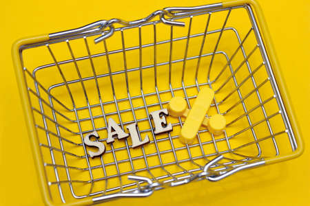 Shopping cart, shopping basket with the inscription sale yellow background. Minimal style, Sale, discounts.