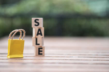 Wooden blocks with the word sale and miniature paper shopping bag. Shopping concept