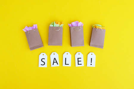 Black Friday, yellow kraft shopping bag with inscription Sale on yellow background. Black friday sale, discount, recycling, shopping and ecology concept. With copy space.
