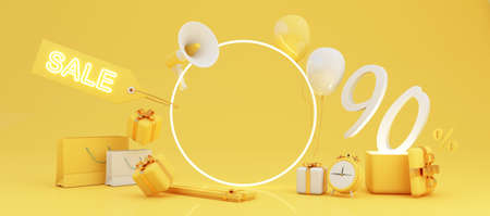 Great discount banner design with SALE 90% text phrase on white and yellow background with gift box, shopping cart bag and alarm clock elements megaphone with product stand 3d rendering
