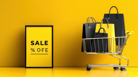 A vibrant sale display featuring a shopping cart filled with stylish bags against a bold yellow background, ideal for retail marketing and promotional campaigns.