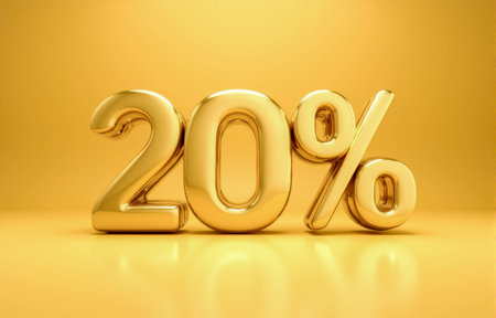 Golden twenty 20 percent. Shiny metallic number twenty percent on yellow backdrop symbolizing discount, special offer, promotion, cashback deal, financial marketing, pricing 3d illustration
