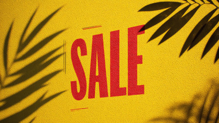 A vivid yellow wall features striking red SALE text, surrounded by the elegant shadows of palm leaves, creating a warm and inviting promotional scene.