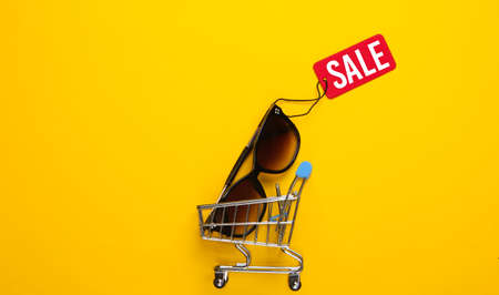 Shopping trolley and fashionable sunglasses with red sale tag on yellow background. Top view. Discount. Minimalism