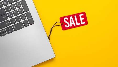 Laptop with a red sale tag on yellow background. Big Sale, discounts, online shopping. Top view