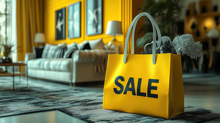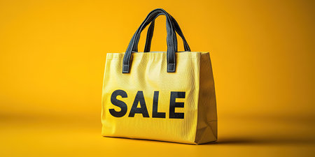 Bright yellow backdrop filled with sale tags and percentage symbols evokes a festive shopping vibe perfect for promotions and discounts.