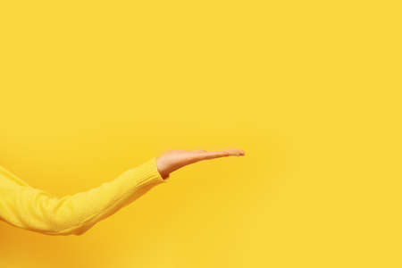 man holding a phone in his hands on a yellow background. Place for your text. View from above