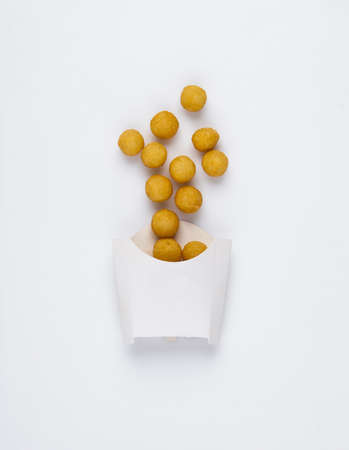 Fried chicken balls in a white box on a white background. studio picture of fried chicken balls