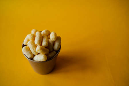 yellow corn sticks in a glass on a colored background, a full box of sweet corn sticks, a treat for children, yellow background, minimalism