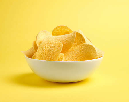 High angle view of potato chips in bowl and on yellow background. unaltered, unhealthy food, snack and salty snack.