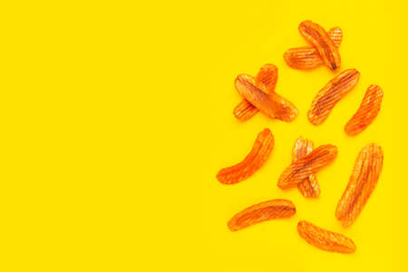 Spicy snack, Banana slice chips paprika flavor on yellow background.